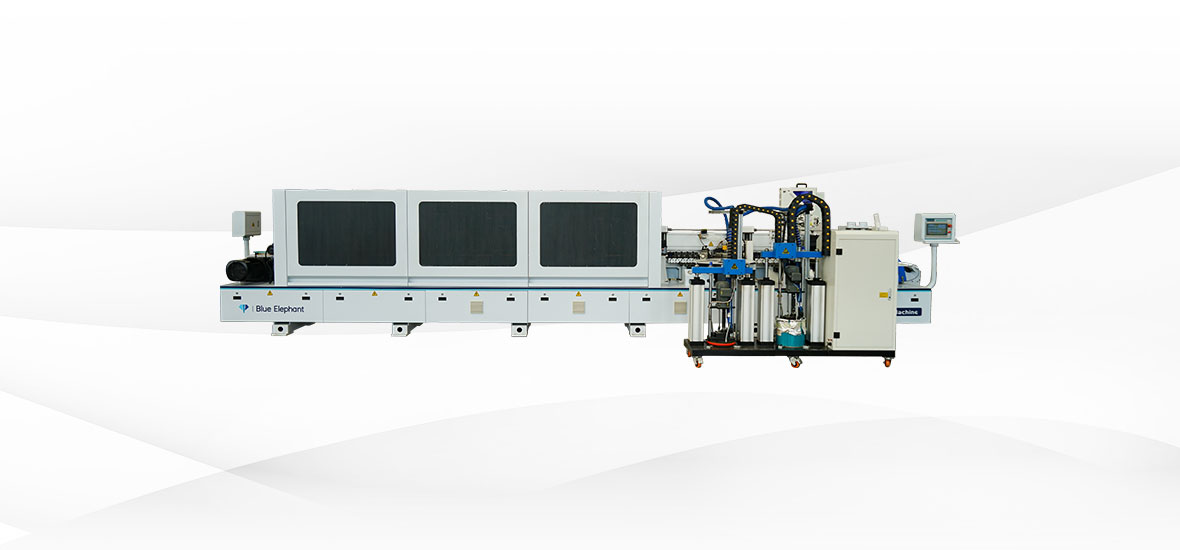 E-70JDSR全自動封邊機(jī)功能:前分離-預(yù)銑-涂膠貼邊1-涂膠貼邊2-齊頭-手動粗修-手動精修-跟蹤倒角-刮邊-平刮-后清洗-拋光1-拋光2